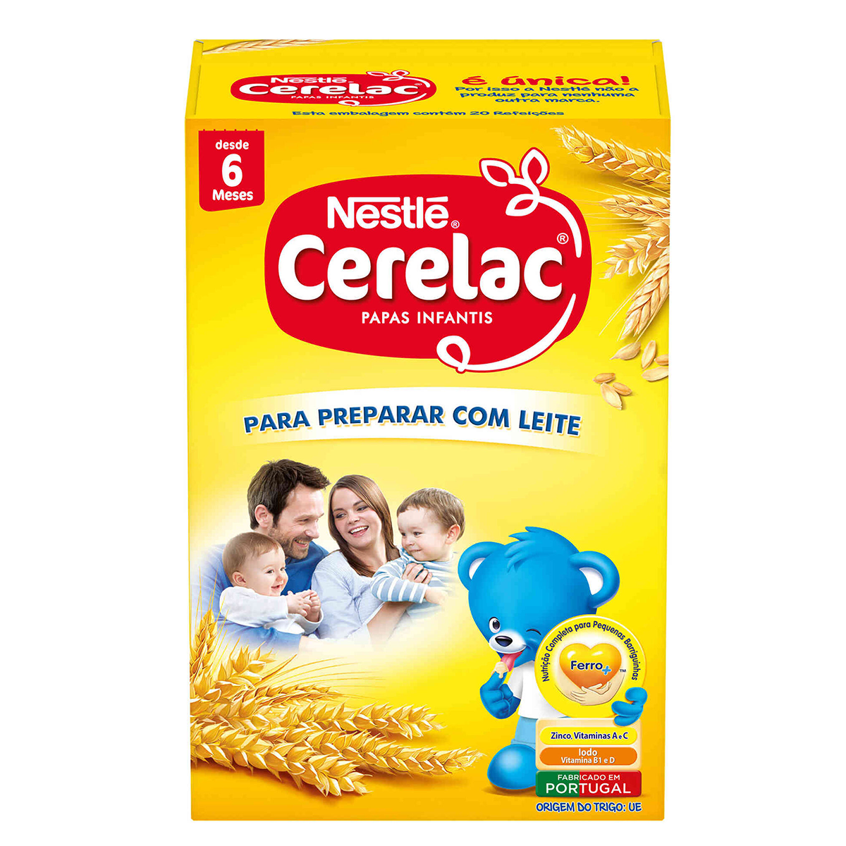 Papa infantil Cerelac para preparar com leite. Uma refeição completa e equilibrada para bebés, fácil de preparar. Rica em vitaminas, minerais e ferro. Adaptável às necessidades do bebé.